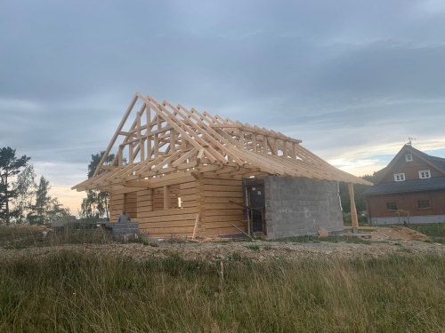 Realizace krovu na roubenou stavbu. Sedlový krov s vikýři.